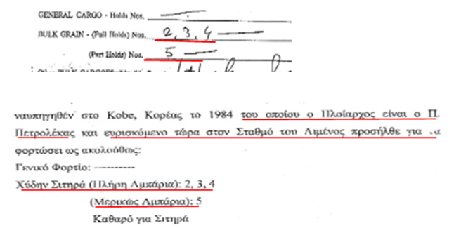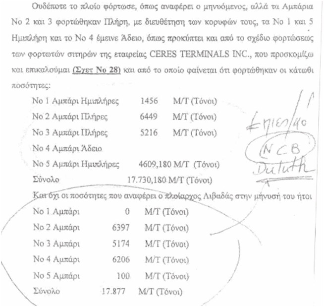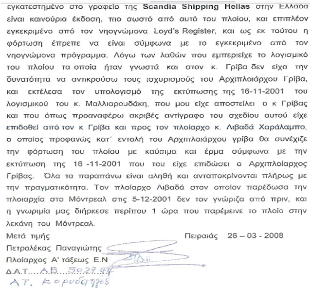 Βλέπεται όταν η φόρτωση είναι πλασματική ο εφοπλιστής Σταυρινίδης πληρώνει $80.000 ΗΠΑ, ενώ όταν η φόρτωση είναι πραγματική και επικίνδυνη ο εφοπλιστής Σταυρινίδης δεν πληρώνει τίποτα. Από τα ανωτέρω προκύπτει ότι, το αμέσως ανωτέρω παράδειγμα του δικού μου ισχυρισμού με φορτίο 17877 ΜΤ στα (3) μεσαία αμπάρια εκ του συνόλου (5) αμπαριών του πλοίου και δεύτερη κατά σειρά των φορτώσεων της σελίδας (9) της μήνυσής τους, ΑΒΜ Α09 2668 Πειραιά (Σχ. 22), την οποία οι ίδιοι αρνούνται μετά βλεγδυμμίας, η οποία όμως είναι όμοια με αυτήν που βεβαιώνει το ‘’Πιστοποιητικό ετοιμότητας’’ και με τις ποσότητες φορτίου σε κάθε ένα αμπάρι χωριστά όμοια με αυτά της δεύτερης κατά σειρά φόρτωση της σελίδας (9), όπως αυτά αναφέρονται στο ‘’Πιστοποιητικό ετοιμότητας’’ αριθμητικά, ήτοι Αμπάρια (2,3,4) πλήρως και μερικώς το αμπάρι (5), με κενό φορτίου το αμπάρι (1). Όλα τα ανωτέρω επιβεβαιώνονται και από τον πλοίαρχο Πετρολέκα Παναγιώτη, ο οποίος φόρτωσε ο ίδιος το πλοίο επικίνδυνα ύστερα από εντολή του αρχιπλοιάρχου Γρίβα Παναγιώτη, όπως επιβεβαιώνει ο ίδιος στην από 26-03-2008 επιστολή του (Σχ.21 και σελ. 19 της παρούσης) και (Σχ. 2) της μήνυσής μου. Παραθέτω φωτογραφικό απόσπασμα της από 26-03-2008 επιστολής του πλοιάρχου κ. Πετρολέκα Παναγιώτη, η οποία αναφέρει τα εξής.