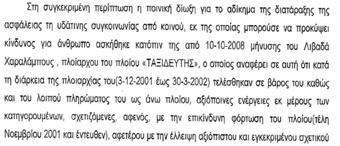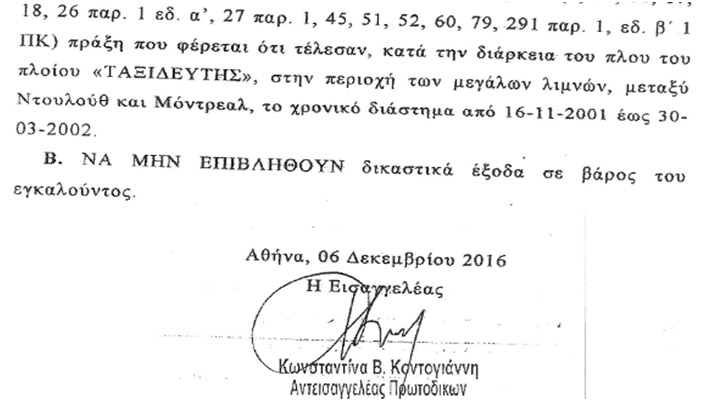 Το υπό αριθ. 4743/2016 Βούλευμα του Συμβουλίου Πλημμελειοδικών Αθηνών εξεδόθη την 29-12-2016 επί της μήνυσής μου 10-10-2008 ΠΕΡΑΙΑ, (η οποία απεστάλη από τα καθ’ ύλη αρμόδια ναυτικά δικαστήρια του Πειραιά, στα μη εξ’ ειδικευμένα δικαστήρια των Αθηνών με στοιχεία ΙΓ 2010 19536 Αθηνών). ενώπιον του Εισαγγελέως Πλημμελειοδικών Πειραιώς κατά των α) Σταύρου Σταυρινίδη, πλοιοκτήτη του πλοίου ‘’Ταξιδευτής’’ β) Γρίβα Παναγιώτη, Αρχιπλοιάρχου της διαχειρίστριας του ως άνω πλοίου εταιρείας με την επωνυμία‘’Scandia Shipping Hellas’’ γ) Τζαμαρία Νικολάου (DPA) και δ) Μπούλου Ελμιράχεμ, (Τυπικός εκπρόσωπος), ή, νόμιμος εκπρόσωπος της ως άνω διαχειρίστριας του πλοίου εταιρείας δυνάμει της οποίας ασκήθηκε εναντίον τους ποινική δίωξη για το αδίκημα της ‘’Διατάραξης της ασφάλειας της υδάτινης συγκοινωνίας εκ της οποίας μπορούσε να προκύψει κίνδυνος για άνθρωπο’’.