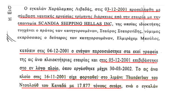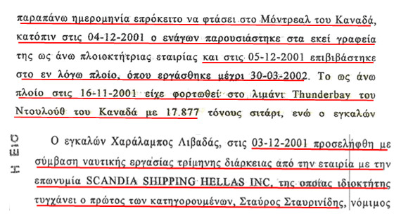 H 2α Ανακρίτρια Αθηνών κ. Βιοπούλου Ιωσηφίνα στην ανωτέρω παράγραφο αναφέρει εσφαλμένως ότι, ναυτολογήθηκα στις 3-12-2001, ενώ τα πραγματικά περιστατικά τα οποία επιβεβαιώνω είναι τα εξής: α) Η διάρκεια της πλοιαρχίας μου δεν ήταν από τις 3-12-2001 έως 30-03-2003, δεδομένου ότι στις 3-12-2001 υπέγραψα την σύμβαση εργασίας στα γραφεία της εταιρείας ‘’Scandia Shipping Hellas’’ η οποία εδράζεται στην Βούλα Αττικής, οδός Βασιλέως Παύλου 34Α). Και στις 5-12-2001 και ώρα 05:30 τοπική ώρα Μόντρεαλ, ναυτολογήθηκα ως πλοίαρχος επί του πλοίου ‘’Ταξιδευτής’’ στο Μόντρεαλ του Καναδά, όπου ταυτόχρονα κατέπλευσε στο Μόντρεαλ, στην (Λεκάνη εισόδου του Μόντρεαλ) και το πλοίο ‘’Ταξιδευτής’’, προερχόμενο από το λιμάνι φόρτωσης Ντουλούθ των ΗΠΑ, με ημερομηνία και ώρα απόπλου από Ντουλούθ 30-11-2001 και ώρα 16:20 τοπική ώρα.