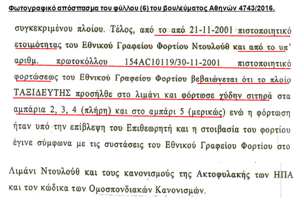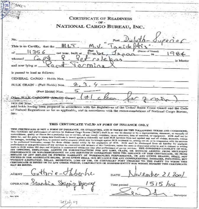 Το πλοίο ‘’Ταξιδευτής’’ σύμφωνα με το ανωτέρω απόσπασμα φορτώθηκε επικίνδυνα (τέλη Νοεμβρίου 2001) στο λιμάνι φόρτωσης Ντουλούθ των ΗΠΑ υπό την πλοιαρχία του πλοιάρχου κ. Πετρολέκα Παναγιώτη. Σύμφωνα με το ‘’Ημερολόγιο λιμένος’’, ‘η, (Statement of Facts), βάσει του οποίου το πλοίο ‘’Ταξιδευτής’’ περάτωσε την επικίνδυνη φόρτωση του στο λιμάνι Ντουλούθ, στις 30-11-2001 και αναχώρησε αυθημερόν στις 16:20 τοπική ώρα ΗΠΑ. Δεδομένου όμως ότι, οι ημερομηνίες 3-12-2001, που εγώ υπέγραψα την σύμβαση εργασίας μου στην Ελλάδα και η 5-12-2001 που εγώ ναυτολογήθηκα στο πλοίο ‘’Ταξιδευτής, είναι μεταγενέστερες της 30-11-2001 που έλαβε χώρα η περάτωση της επικίνδυνης φόρτωση του πλοίου ‘’Ταξιδευτής’’ στο λιμάνι Ντουλούθ.