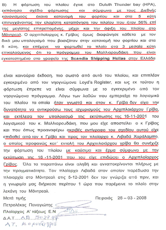 Ο πλοίαρχος Πετρολέκας Παναγιώτης επιβεβαιώνει ότι, πιεζόμενος τόσο από τον αρχιπλοίαρχο Γρίβα Παναγιώτη, όσο και από τον επιθεωρητή στο λιμάνι φόρτωσης Ντουλούθ κ. Sencer Under, φόρτωσε παρά την θέλησή του το πλοίο επικίνδυνα στα (3) μεσαία αμπάρια εκ του συνόλου (5) αμπαριών του πλοίου, ήτοι τα αμπάρια (2,3,4) πλήρη και οι 100 ΜΤ οι οποίοι περίσσεψαν φορτώθηκαν αναγκαστικά στο αμπάρι (5), οι οποίοι αποτελούν αμελητέα ποσότητα συγκριτικά με τους 17.777 των τριών μεσαίων αμπαριών του πλοίου (2,3,4). και μερικώς το αμπάρι (5), δεδομένου ότι η εκ δόλου κακόβουλη ενέργεια κατά του πλοίου και των επιβαινόντων μελλών του πληρώματος δεν προήλθε από την διαφορά του φορτίου μεταξύ των αμπαριών, αλλά από την θέση που είχαν τα συγκεκριμένα φορτωμένα αμπάρια (2,3,4) στο μέσον της δοκού, αν θεωρήσουμε το πλοίο ως μία απλή δοκό, όπου είναι και η πραγματικότητα, αφού το πλοίο πράγματι χτίζεται στο ναυπηγείο και στηρίζεται όλο σε μια ατσάλινη δοκό η οποία ονομάζεται τρόπιδα του πλοίου, η οποία εν προκειμένω είχε 180 Μ μήκος.