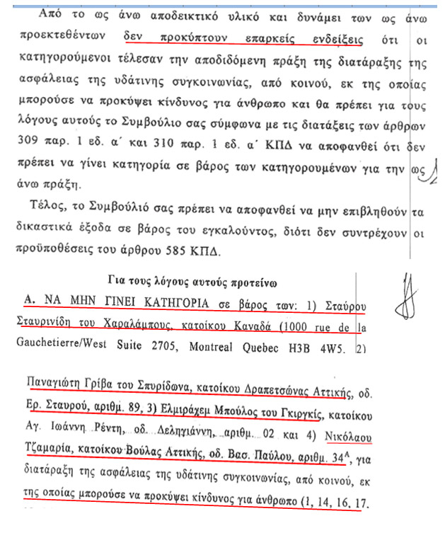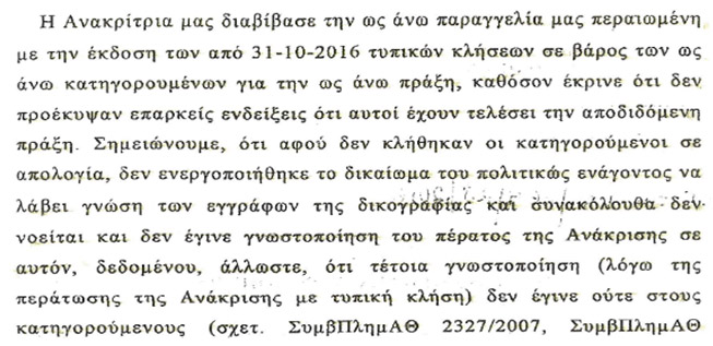 ΣΗΜΕΙΩΣΗ. Καλά, αφού δεν κλήθηκαν οι κατηγορούμενοι στην ανάκριση, ούτε καν προς απολογία, πως έκρινε η 2α Ανακρίτρια Αθηνών κ. Βιοπούλου Ιωσηφίνα, ότι «δεν υπήρχαν επαρκείς ενδείξεις για να ασκηθεί ποινική δίωξη εναντίον τους» και μάλιστα ήταν τόσο βεβαία για την κρίση της, που δε χρειάστηκε ούτε καν να τους ενοχλήσει με κλήση, όχι βέβαια για τα όσα λέει, αλλά διότι αν τους ειδοποιούσε με κλήση πριν την 15ετία, τότε η υπόθεση θα έπαιρνε παράταση για την 20ετία, έτσι εξηγείται και η ενέργεια της 2ας ανακρίτριας Αθηνών κ. Βιοπούλου Ιωσηφίνας να καθυστερήσει (6) χρόνια την υπόθεση αυτή στο συρτάρι της, διαφορετικά θα την είχε διεκπεραιώσει ενωρίτερα.