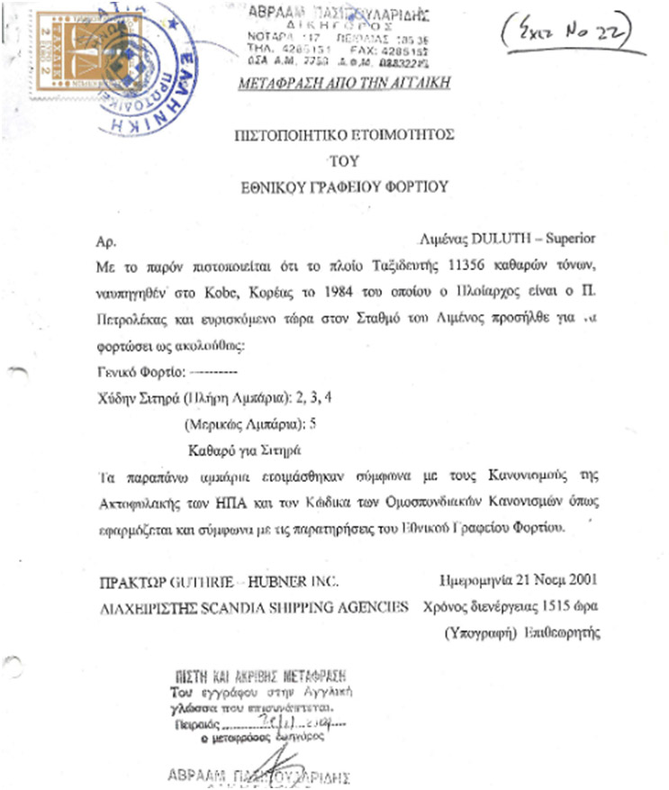 Αμέσως πιο κάτω παραθέτω φωτογραφικά την επικυρωμένη μετάφραση η οποία έχει γίνει από τον δικηγόρο Πειραιά του εφοπλιστή Σταυρινίδη κ. Αβραάμ Πασιπουλαρίδη. Το ‘’Πιστοποιητικό ετοιμότητας’’, το έχει προσκομίσει ο ίδιος ο εφοπλιστής Σταυρινίδης το οποίο και κατέθεσε στην εισαγγελία πρωτοδικών Αθηνών, από την οποία εγώ πήρα επικυρωμένα αντίγραφα.