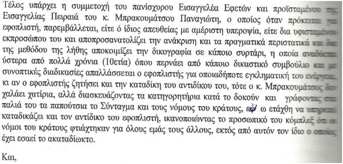Κύριε εισαγγελέα, ως μάρτυρας υπεράσπισης του δημοσίου συμφέροντος, είμαι ο μοναδικός Έλληνας πολίτης ο οποίος χωρίς κουκούλα και χωρίς να έχω ίδιον όφελος, παρά μόνον απειλές και κίνδυνο για την ζωή μου, δεδομένου ότι, την μήνυση αυτή δεν την έκανε αυτεπάγγελτα κάποιος υφιστάμενος σας εισαγγελέας του Πειραιά, αλλά την έκανα εγώ και στην οποία μεταξύ άλλων αναφέρω ότι, ο τέως εισαγγελέας εφετών Πειραιά και νυν αντιεισαγγελέας του Αρείου Πάγου (Μπρακουμάτσος Παναγιώτης) διευκόλυνε – συγκάλυψε και συγκαλύπτει ακόμη την υπόθεση αυτή, από οποιοδήποτε μετερίζι κι αν βρίσκεται. Αμέσως πιο κάτω παραθέτω αποσπάσματα της καταγγελίας μου προς την τότε εισαγγελέα του Α.Π κ. Δημητρίου Ξένη την οποία εγκαλώ για όλα όσα αναφέρονται στην παρούσα, δεδομένου ότι την θεωρώ γενεσιουργό αιτία της όλης κατάστασης αυτής, με υπαρχηγό της, την νυν αντιεισαγγελέα του Α.Π. κ. Θεοδώρου Βασιλική. Παραθέτω φωτογραφικό απόσπασμα.
