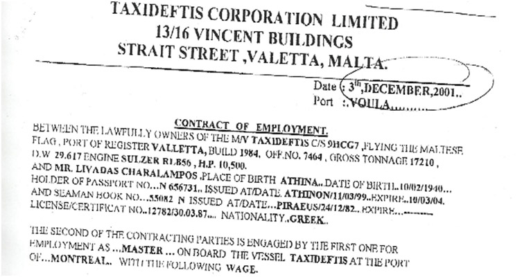 Βάσει των ανωτέρω προκύπτει ότι, ο πλοίαρχος ο οποίος φόρτωσε το πλοίο επικίνδυνα στο λιμάνι φόρτωσης Ντουλούθ των ΗΠΑ στις 30-11-2001 που το πλοίο ‘’ταξιδευτής’’ περάτωσε την φόρτωσή του και απέπλευσε αυθημερόν στις 16: 20, σίγουρα δεν ήμουν εγώ, δεδομένου ότι εγώ στις 30-11-2001 ήμουν σπίτι μου στην Αθήνα και δεν είχα καμία σχέση με το πλοίο ‘’Ταξιδευτής’’! Επιπρόσθετα προκύπτει ότι, ο πλοίαρχος ο οποίος πήρε απόπλου παρανόμως στις 30-11-2001 που το πλοίο απέπλευσε από Ντουλούθ δεν ήμουν εγώ, απλά διότι εγώ στις 30-11-2001 που το πλοίο πήρε απόπλου και αναχώρησε από το λιμάνι φόρτωσης Ντουλούθ των ΗΠΑ, εγώ βρισκόμουν στην Ελλάδα στο σπίτι μου. Από πού επιβεβαιώνονται τα ανωτέρω; Παραθέτω αμέσως πιο πάνω την σύμβαση εργασίας την οποία υπέγραψα στις 3-12-2001 στα γραφεία της εταιρείας ‘’Scandia Shipping Hellas’’ στην Ελλάδα και συγκεκριμένα στην Βούλα Αττικής οδός Βασιλέως Παύλου 34 Α. (Σχ.78).