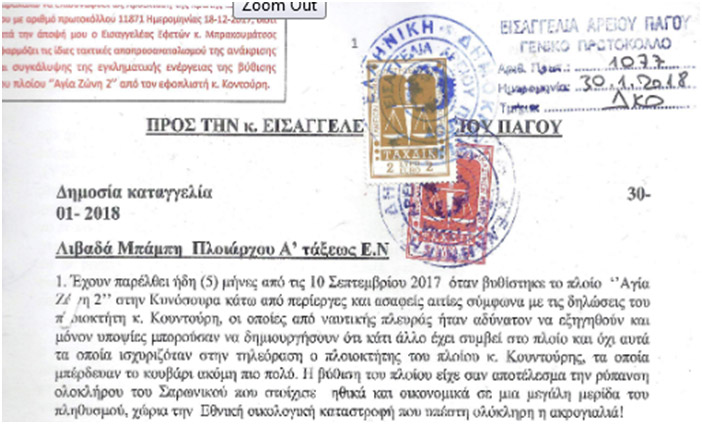 Γι αυτό θα φρεσκάρω την μνήμη σας κ. εισαγγελέα όσον αφορά τις εγκληματικές ενέργειές σε παρόμοια υπόθεση με τον εφοπλιστή Σταυρινίδη Σταύρο, ο οποίος διέπραξε δολιοφθορά στο πλοίο του ‘’Ταξιδευτής’’ προκειμένου να εισπράξει την ασφάλεια του πλοίου αδιαφορώντας για την τύχη του 27μελούς πληρώματος του, μια εγκληματική ενέργεια του πρόσφατου παρελθόντος, δεδομένου ότι, το συναφές βούλευμα με ην υπόθεση αυτή, Αθηνών 4743/2016, σε συνδυασμό με την από 8-05-2019 διάταξη της Αντιεισαγγελέα του (Α.Π κ. Θεοδώρου βασιλικής με αριθμ. πρωτοκόλλου 11871/2017 και αρυθ. Διαταγής4/19, βάσει της οποίας συγκάλυψε τον νυν αντιεισαγγελέα του Α.Π. κ. Μπρακουμάτσο Παναγιώτη, ο οποίος είχε αναλάβει εργολαβικά την απαλλαγή του εφοπλιστή Σταυρινίδη δια βουλεύματος και επιπρόσθετα η κ. Θεοδώρου επικύρωσε και την απόφαση 4743/2016 του Συμβουλίου Πλημμελειοδικών Αθηνών βάσει της οποίας έστειλαν την υπόθεση αυτή στο αρχείο, ενώ με τα ίδια αυτά απόλυτα στοιχεία που παρουσίασαν στο Συμβούλιο πλημμελειοδικών η 2α ανακρίτρια Αθηνών κ. Βιοπούλου Ιωσηφίνα και η εισαγγελέας Αθηνών κ. Κοντογιάννη Κωνσταντίνα, θα έπρεπε να έχει ασκηθεί ποινική δίωξη σε βαθμό κακουργήματος βάσει των δυο αυτών στοιχείων, ήτοι, του ‘’Πιστοποιητικού ετοιμότητας’’ (Σχ. 32) και άσκηση ποινικής δίωξης βάσει του ‘’Πιστοποιητικού φόρτωσης’’ (Σχ. 40) το οποίο εμπεριείχε πλαστογραφημένες πληροφορίες και ψευδές περιεχόμενο, προερχόμενα από άλλα συναφή πλαστογραφημένα έγγραφα της φόρτωσης του πλοίου. Οι ενέργειες αυτές του παρελθόντος και ο τρόπος με τον οποίον έστειλαν την υπόθεση του εφοπλιστή Σταυρινίδη στο αρχείο, μοιάζει ωσάν δίδυμο αδελφάκι με τα σημερινά γεγονότα της ανάκρισης του πλοίου ‘’Αγία Ζώνη ΙΙ’’, η οποία, όπως προδιαγράφεται σήμερα, με πέπλο μυστηρίου και νεκρική σιωπή, όσον αφορά την εξέλιξη της ανάκρισης για την υπόθεση της καταστροφής του Σαρωνικού κόλπου και τις μεθόδους τις οποίες μεταχειρίζονται προκειμένου να πετύχουν τον αντικειμενικό σκοπό τους, να οδηγήσουν την υπόθεση στο αρχείο, είναι φαεινότερο Ηλίου ότι, πράγματι οδηγείται στο αρχείο, ή, τουλάχιστον ο κόσμος έχει χάσει την εμπιστοσύνη του και κουνάει το κεφάλι του με απορία, επομένως για ποια ασφάλεια του πολίτη μιλάμε κ. εισαγγελέα Πλιώτα;