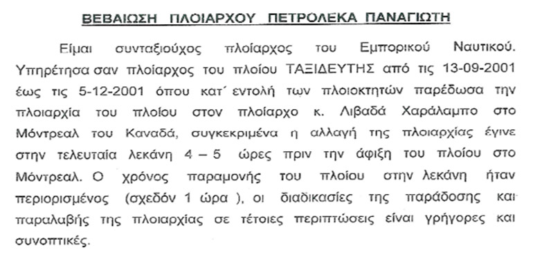 Δεδομένου ότι, όλα τα υπάρχοντα στοιχεία, ήταν ενάντια στην κρίση της 2ας Ανακρίτριας Αθηνών κ. Βιοπούλου, για την εύκολη και υπό ερωτηματικά κρίση της, η οποία αφήνει άρωμα διαπλοκής, δεδομένου ότι, ο πλοίαρχος του πλοίου ‘’Ταξιδευτής’’ κ. Πετρολέκας Παναγιώτης, ο οποίος φόρτωσε το πλοίο επικίνδυνα ο ίδιος στις 30-11-2001 στο λιμάνι Ντουλούθ των ΗΠΑ με 17.877 ΜΤ σιτάρι, με την από 26-03-08 επιστολή του (Σχ. 21) και σελίδα (20 ) της παρούσης, βεβαιώνει ότι, ο ίδιος αναλαμβάνοντας πλήρως την ευθύνη ότι, αυτός φόρτωσε το πλοίο επικίνδυνα στα (3) μεσαία αμπάρια, ύστερα από πιέσεις που δέχτηκε από τον αρχιπλοίαρχο Γρίβα. Σημείωση.