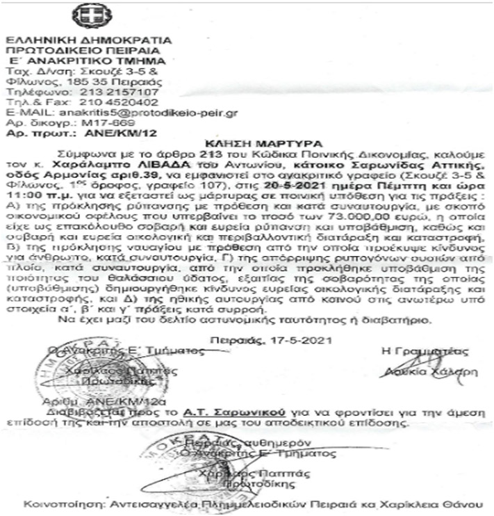 Ο Πλοίαρχος Χαράλαμπος Λιβαδάς απέστειλε επιστολή προς τον Εισαγγελέα του Αρείου Πάγου σχετικά με την πολύκροτη υπόθεση του «ΑΓΙΑ ΖΩΝΗ ΙΙ». Σημειώνεται ότι ο Πλοίαρχος είναι μάρτυρας στη συγκεκριμένη δυσώδη υπόθεση, που είχε ως αποτέλεσμα τη ρύπανση όλου του Σαρωνικού.