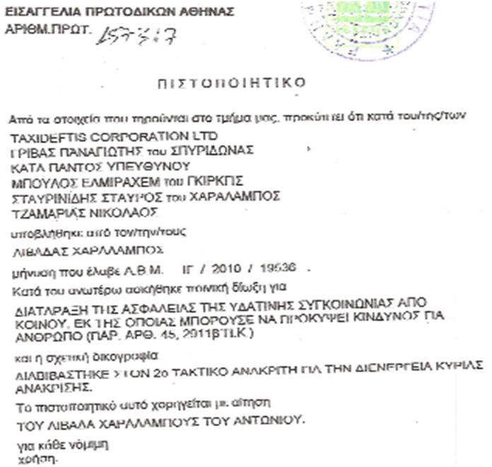 επιπρόσθετα η παρούσα καταγγελία μου να κατατεθεί ως μηνυτήρια αναφορά για το αδίκημα της πλαστογραφίας μετά χρήσεως όσον αφορά το ‘’Πιστοποιητικό φόρτωσης’’ (Σχ. 40) που κατετέθη στην εισαγγελία Αθηνών και χρησιμοποιήθηκε για την εκ δόλου απαλλαγή τους από το Συμβούλιο Πλημμελειοδικών Αθηνών με το Βούλευμα Αθηνών 4743/2016, αυτά έπραξαν η Δευτέρα ανακρίτρια Αθηνών και η εισαγγελέας Αθηνών κ. Κοντογιάννη Κωνσταντίνα, ύστερα από εντολές της αντιεισαγγελέα του Α,Π κ. Θεοδώρου Βασιλικής, του Μπρακουμάτσου Παναγιώτη και του εφέτη Καλλίδη Νικολάου, οι οποίες ζήτησαν από το συμβούλιο πλημμελειοδικών την απαλλαγή τους!.
