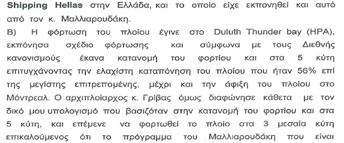 Η ανωτέρω επιστολή του πλοιάρχου Πετρολέκα Παναγιώτη, προηγούμενου από εμένα πλοιάρχου του πλοίου ‘’Ταξιδευτής’’, ο οποίος ήταν πλοίαρχος το επίδικο διάστημα στο λιμάνι φόρτωσης Ντουλούθ, δεδομένου ότι ναυτολογήθηκε στις 13-09-2001 και μου παρέδωσε την πλοιαρχία στις 5-12-2001 στο Μόντρεαλ (τελευταία λεκάνη). Όσον αφορά την από 16-11-2001 επικίνδυνη φόρτωση του πλοίου ‘’Ταξιδευτής’’ την οποία ο ίδιος εκτέλεσε επί του πλοίου στις 30-11-2001 στο λιμάνι Ντουλούθ των ΗΠΑ (Σχ.17,σελ.2), υπό την πίεση του αρχιπλοιάρχου Γρίβα Παναγιώτη, με ηθικό αυτουργό τον εφοπλιστή Σταυρινίδη, με την αμέριστη συμπαράσταση του τοπικού επιθεωρητή στο λιμάνι φόρτωσης Duluth κ. Sencer Under, ο οποίος, είχε προσχωρήσει στις εγκληματικές απαιτήσεις του εφοπλιστή Σταυρινίδη, δεν αφήνει κανένα λογικό περιθώριο αμφισβήτησης των πραγματικών περιστατικών, αλλά αντίθετα, αποτελεί ισχυρή απόδειξη εναντίον ιδιοτελών αναμνήσεων της εποχής εκείνης, όσον αφορά την εκ δόλου επικίνδυνη φόρτωση του πλοίου ‘’Ταξιδευτής’’, εκ μέρους του εφοπλιστή Σταυρινίδη ως ηθικού αυτουργού και φυσικών αυτουργών τους στενούς του συνεργάτες, οι ενέργειες των οποίων ήταν ανάλογες σύμφωνα με την θέση και τις ιδιότητες ενός εκάστου, αλλά ταυτόχρονα και τις ευθύνες της 2ας Ανακρίτριας Αθηνών κ. Ιωσηφίνας Βιοπούλου, ομού μετά της εισαγγελέα Αθηνών κ. Κοντογιάννη Κωνσταντίνας! Τέλος η 2α ανακρίτρια Αθηνών κ. Βιοπούλου Ιωσηφίνα στο τέλος του πορίσματός της αναφέρει τα εξής: