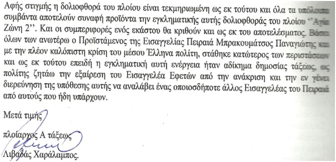Σας γνωρίζω ότι, η νυν αντιεισαγγελέας το Α.Π κ. Θεοδώρου Βασιλική και ο τότε εισαγγελέας εφετών Πειραιά Μπρακουμάτσος Παναγιώτης και νυν αντιεισαγγελέας του Α.Π, προβιβασθείς από την τέως εισαγγελέα του Α. Π κ. Ξένη Δημητρίου σε συνεργασία με την νυν αντιεισαγγελέα του Αρείου Πάγου κ. Θεοδώρου Βασιλική, του οποίου η προαγωγή προήλθε, επ’ ευκαιρία της απαίτησης μου, να αντικατασταθεί για λόγους τους οποίους αναφέρω στις σελίδες (4) και (5) της παρούσης, όπου ζητώ από τον (Α.Π) την αντικατάστασή του από την ανάκριση της υπόθεσης της βύθισης του πλοίου ‘’Αγία Ζώνη ΙΙ’’ κατηγορώντας τον ευθέως ότι αποπροσανατολίζει την ανάκριση και αποκοιμίζει την δικογραφία στο συρτάρι του και γενικότερα διευκολύνει και συγκαλύπτει την υπόθεση αυτήν.