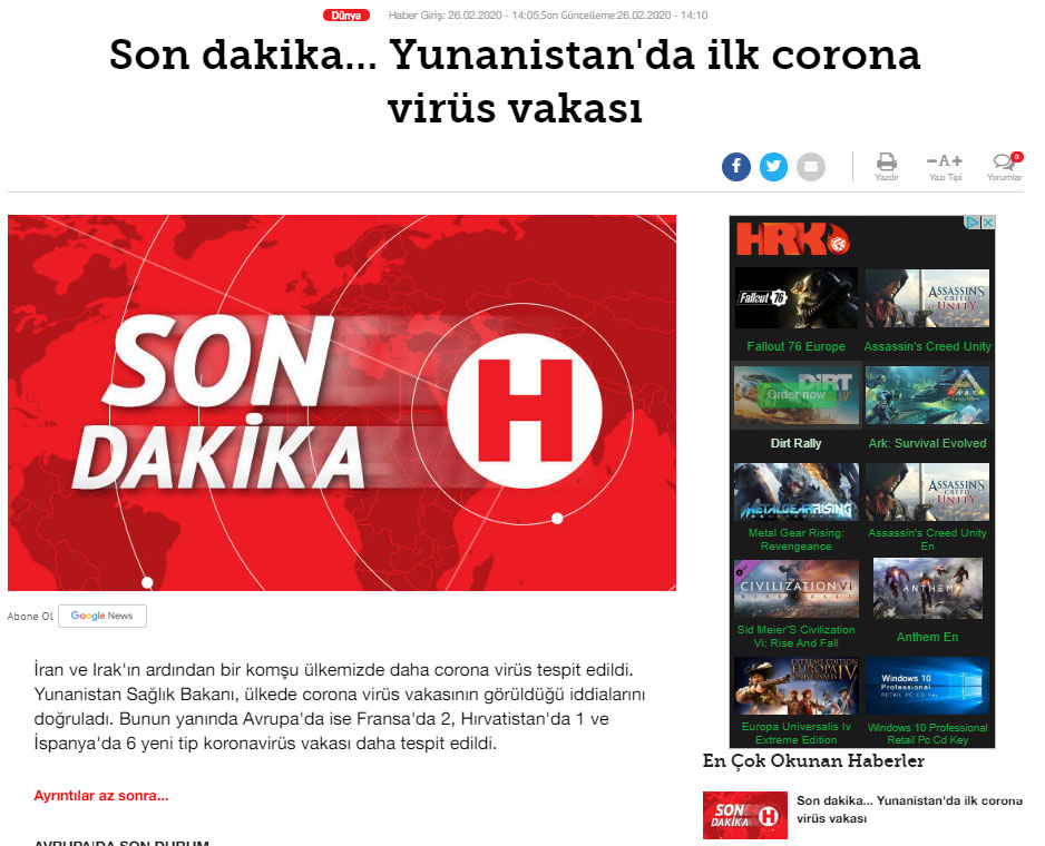 Αμέσως αναμεταδόθηκε η είδηση για το πρώτο κρούσμα στην Ελλάδα από την τουρκική εφημερίδα Hurriyet με την επισήμανση «Μετά το Ιράν και το Ιράκ άλλος ένας γείτονάς μας είναι θετικός στον κορωνοϊό». Η Hurriyet επικαλείται ως πηγή το ελληνικό Υπουργείο Υγείας.