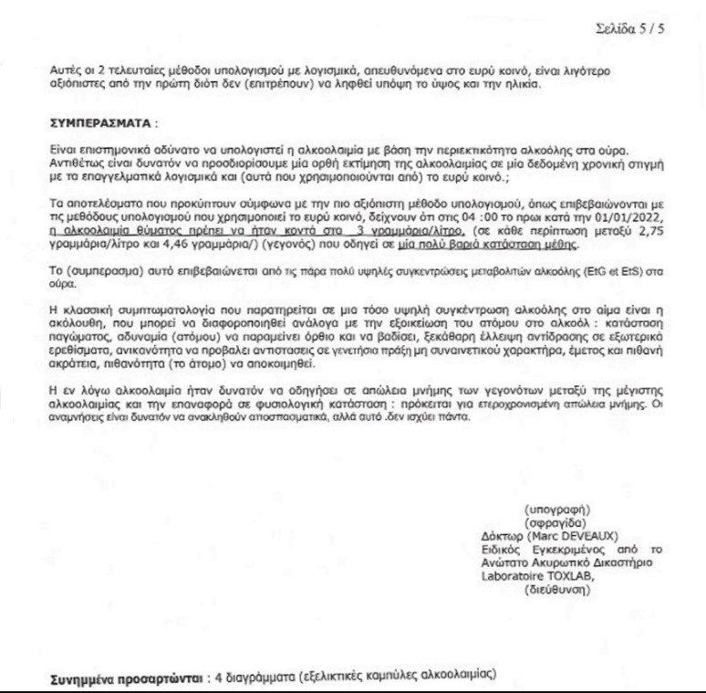 «Όπως προείπα, ο τρόπος με τον οποίο έγινε η ανάλυση από τον συγκεκριμένο τοξικολόγο δεν ήταν η ενδεδειγμένη. Ήταν ένας απλοϊκός τρόπος, ένας σύντομος τρόπος, όπως τον αναφέρουν και οι Γάλλοι, ο οποίος δεν ταιριάζει στη βαρύτητα της υπόθεσης. Η εν λόγο υπόθεση έπρεπε να αναλυθεί με συγκεκριμένα μοντέλα, όπως αναλύθηκε από τους Γάλλους, για να έχουμε ακριβή αποτελέσματα. Αυτό που με προβληματίζει δεν είναι ότι δεν συμφωνούν τα αποτελέσματα μεταξύ τους. Αυτό που με προβληματίζει είναι για ποιον λόγο είναι εκ διαμέτρου αντίθετα τα αποτελέσματα μεταξύ τους. Το δικό μου το αποτέλεσμα έπειτα από τη δική μου την ανάλυση ταιριάζει πιο πολύ με αυτό των Γάλλων παρά με του κύριου Ράικου. Και θεωρώ ότι των Γάλλων είναι το πιο σωστό. Γιατί οι Γάλλοι ανέλυσαν την ποσότητα της αλκοόλης με τέσσερις διαφορετικούς τρόπους. Και οι τέσσερις καταλήγουν περίπου στην ίδια τιμή συγκέντρωσης, δηλαδή καταλήγουν στο ίδιο συμπέρασμα, ότι η Γεωργία Μπίκα, δεν ήτανε σε θέση να δώσει συναίνεση στις 4.00 -4.30 τα ξημερώματα της 1ης Ιανουαρίου του 2022».