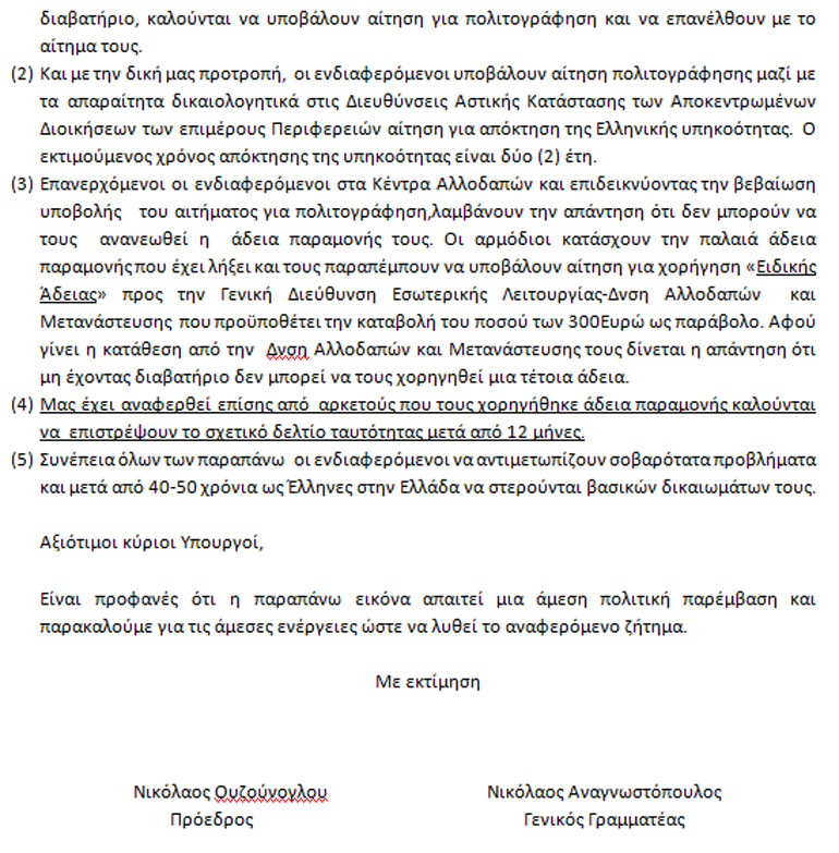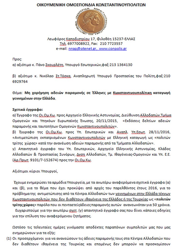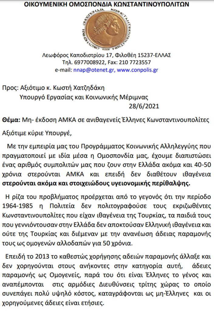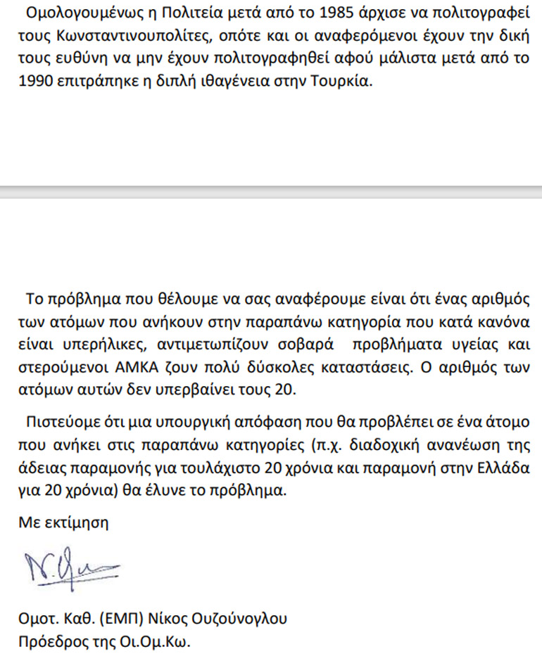 Το πρόβλημα της αναγνώρισης της ελληνικής υπηκοότητας για τους Κωνσταντινουπολίτες φαίνεται ότι είναι διαχρονικό για το ελληνικό κράτος! Παρατίθενται οι δύο επιστολές που είχε στείλει ο Νίκος Ουζούνογλου προς τους αρμόδιους υπουργούς Κωστή Χατζηδάκη πρόσφατα (για τη μη απόδοση ΑΜΚΑ) και το 2018 στους Πάνο Σκουρλέτη και Νίκο Τόσκα (για τη μη χορήγηση αδειών παραμονής).