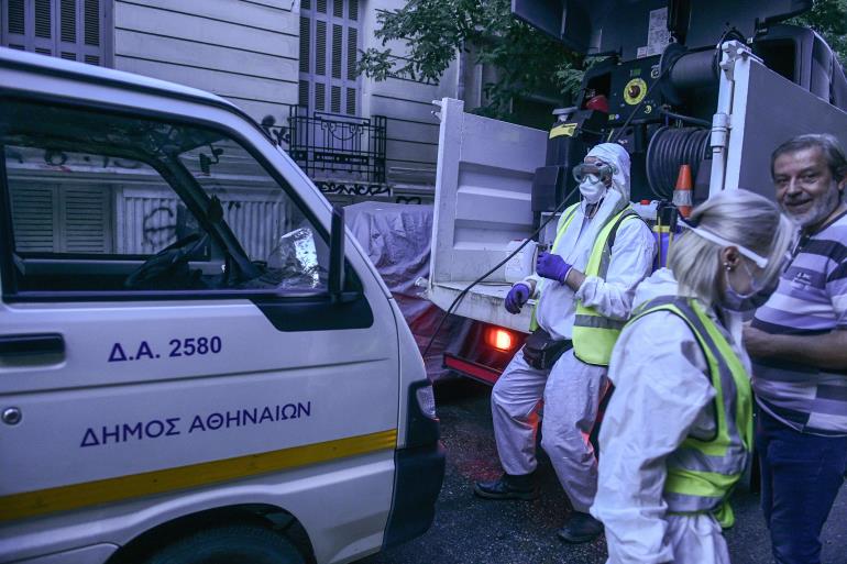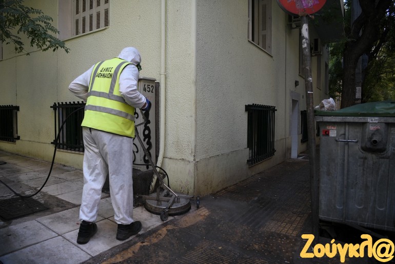 Συνεργεία του Δήμου Αθηναίων, από το πρωί, πλένουν και απολυμαίνουν το οικοδομικό τετράγωνο στην περιοχή του Άγιου Παντελεήμονα, όπου βρίσκεται η δομή φροντίδας ηλικιωμένων.