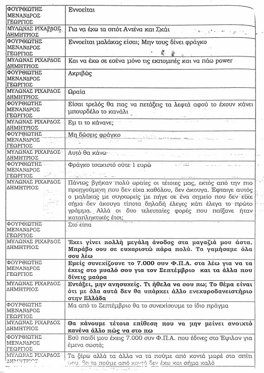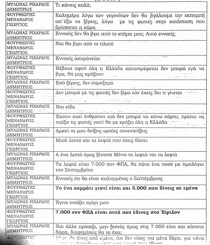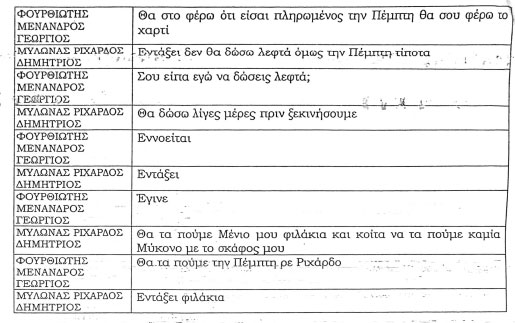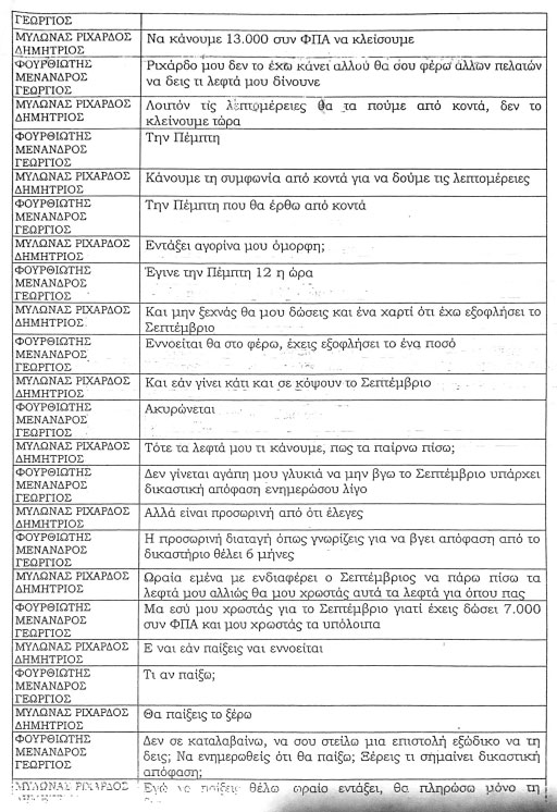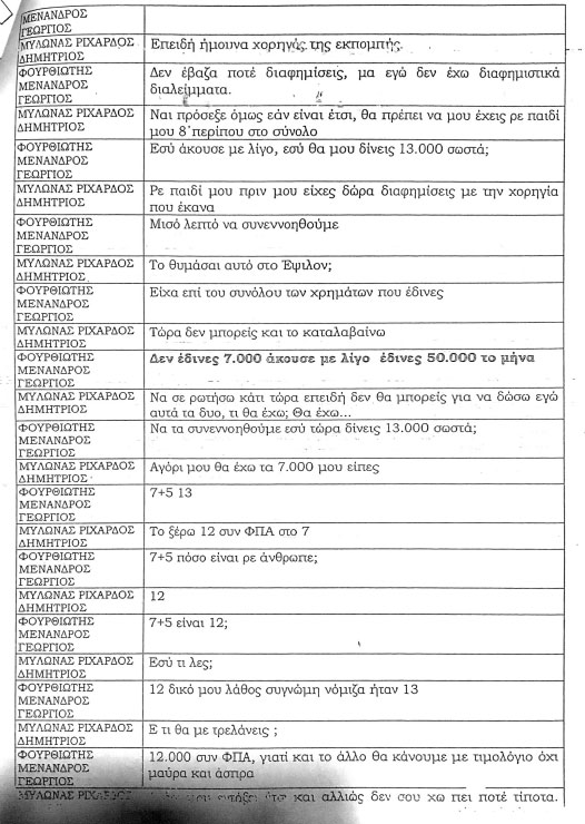 Με ένα λεξιλόγιο που θυμίζει στενοσόκακα των πιο άθλιων λιμανιών του κόσμου, με χυδαίες εκφράσεις εν είδει φιλοφρονήσεων οι κκ. Φουρθιώτης και Ριχάρδος καταλήγουν σε συμφωνίες όπου ξεκάθαρα αναφέρεται η παράνομη διακίνηση χρημάτων.