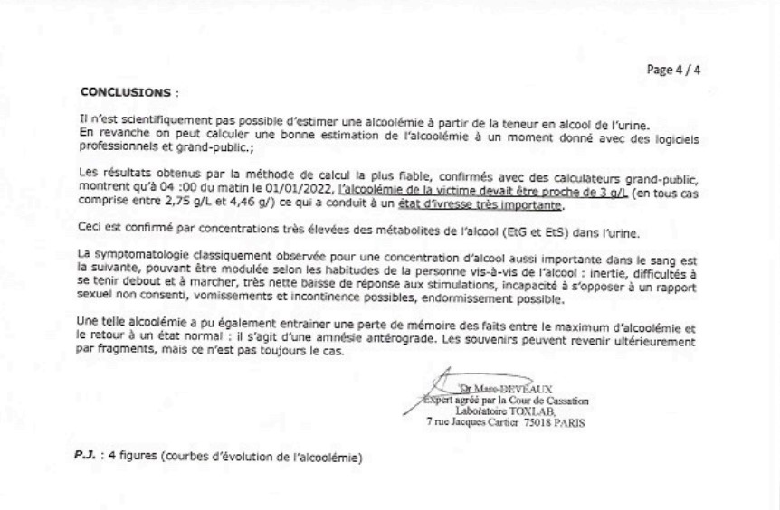Το πόρισμα του γαλλικού εργαστηρίου διαψεύδει όλες τις εμπλεκόμενες ελληνικές αρχές και θεσμούς σε αυτή την υπόθεση. Αποδεικνύει πως το πόρισμα του ελβετικού εργαστηρίου της Βέρνης υπέστη μεθοδευμένη διαστρέβλωση από τις Αρχές που το διαχειρίστηκαν στην Ελλάδα. Καταδεικνύει, πέραν πάσης αμφιβολίας, πως κατά το επίμαχο χρονικό διάστημα του άγριου βιασμού της η Γεωργία Μπίκα δεν ήταν σε θέση ούτε να αντιδράσει ούτε και να αντισταθεί σε γενετήσια πράξη μη συναινετικού χαρακτήρα (δηλαδή βιασμό) λόγω της εξαιρετικά μεγάλης ποσότητας αλκοόλ που είχε συγκεντρωθεί στον οργανισμό της. Για το φύλλο και το βάρος της Γεωργίας Μπίκα τα 3 και τα 4 γραμμάρια αλκοόλ ανά λίτρο αποτελούν τεράστια ποσότητα και επιφέρουν άμεσα όλα τα συμπτώματα που αναφέρει το γαλλικό τοξικολογικό εργαστήριο.
