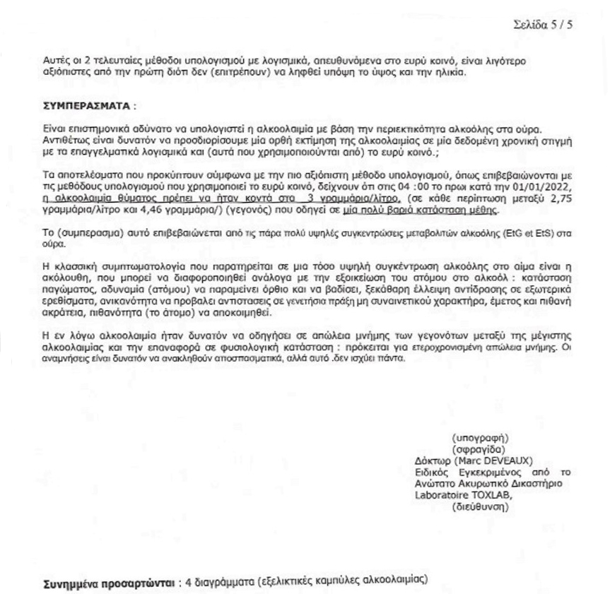 Προκύπτει, λοιπόν, πως τα ξημερώματα της 1ης Ιανουαρίου 2022, και στο επίμαχο διάστημα πριν και μετά τις 04:00, η μέση τιμή αλκοολαιμίας του θύματος ήταν γύρω στα 3 γραμμάρια ανά λίτρο με maximum τιμή τα 4,46 γραμμάρια. Πρόκειται για μια εξαιρετικά σημαντική ποσότητα αλκοόλ στο αίμα.