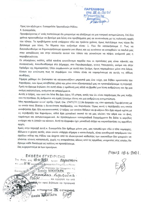Ο κ. Ευριπίδης έχει απευθυνθεί μέσω επιστολής στον Εισαγγελέα Πρωτοδικών Ρόδου, σχετικά με το εν λόγω ζήτημα, όμως δεν υπήρξε ανταπόκριση. Παράλληλα, έχει ζητήσει, εκ μέρους της κοινότητας των Ρομά, την παρέμβαση της πολεοδομίας, του υπουργείου Εσωτερικών, του υπουργείου Δικαιοσύνης και του Πρωθυπουργού.