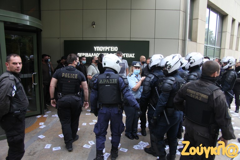 Περίπου 20 άτομα εισέβαλαν στο κτήριο και ανέβηκαν σε όλους τους ορόφους, ενώ επιχείρησαν να μπουν στο γραφείο του υπ. Κώστα Σκρέκα.
