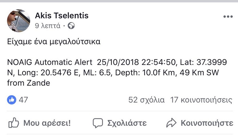 Ο σεισμολόγος Άκης Τσελέντης ανάρτησε στο twitter: