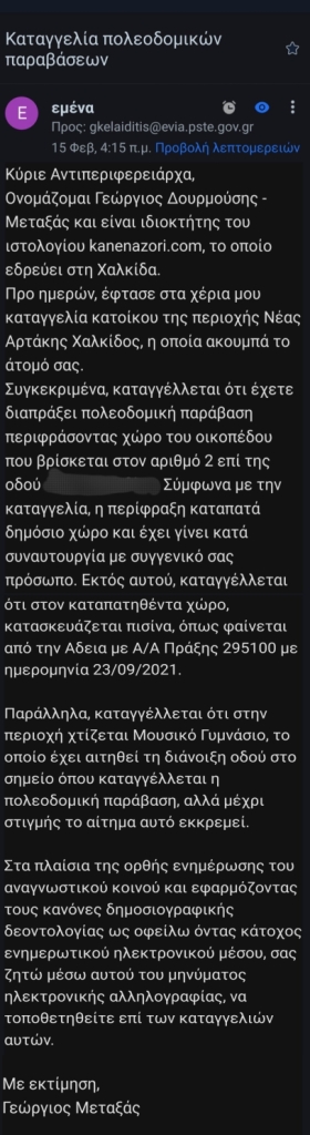 Τόσο σύμφωνα με τα λεγόμενα της καταγγέλουσας όσο και σύμφωνα με το σχέδιο πόλεως, η καταπάτηση υφίσταται. Πώς λοιπόν ο Δήμος Χαλκιδέων χορήγησε άδεια σε παράνομα καταπατημένο έδαφος;