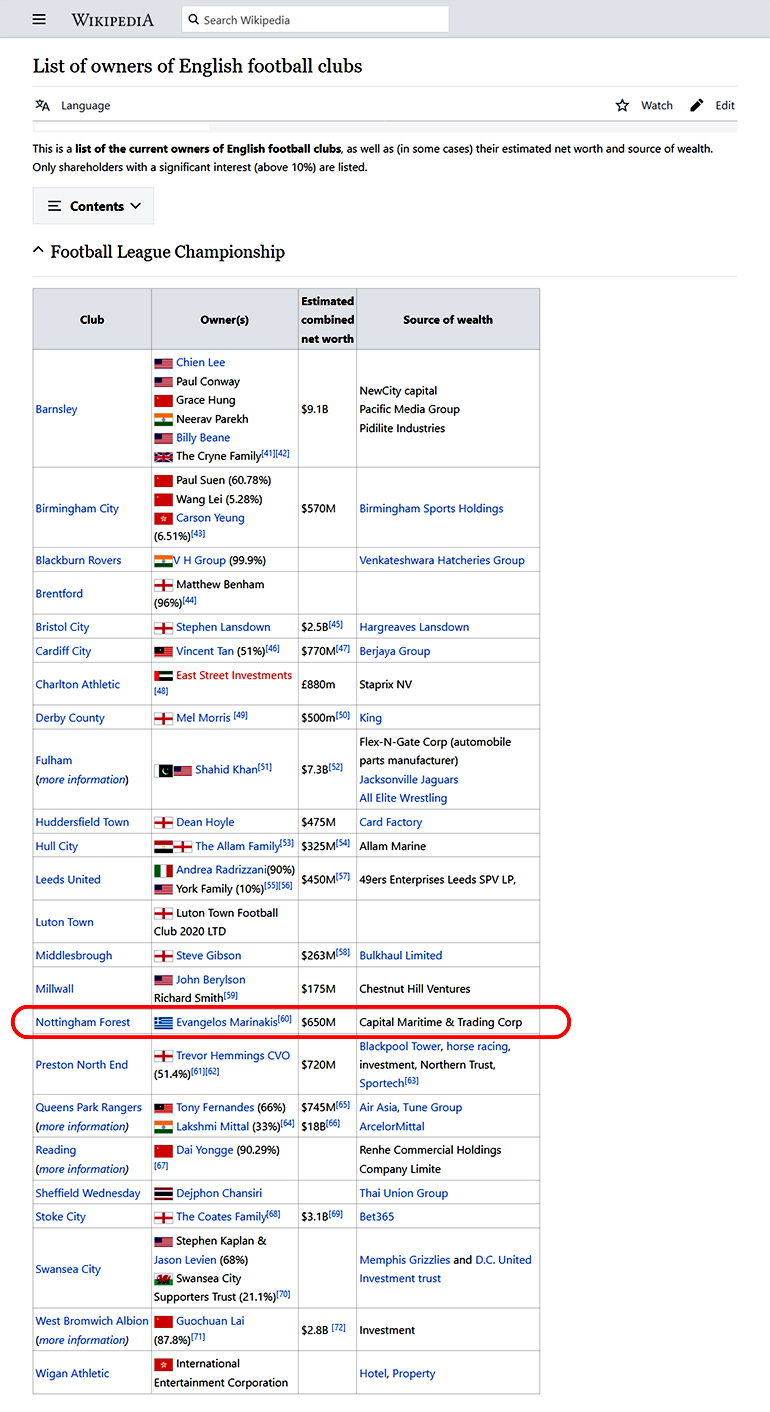 Δείτε τον πίνακα της δεύτερης κατηγορίας, Football League, των «φτωχών» της Αγγλίας, όπου ο κ. Μαρινάκης εμφανίζεται ως ιδιοκτήτης της Nottingham Forest. Δίπλα στα ονόματα των ιδιοκτητών εάν προσέξετε εκτός από την σημαία της ιθαγένειας εκάστου εξ αυτών υπάρχει και η στήλη με την εκτιμώμενη οικονομική τους επιφάνεια.