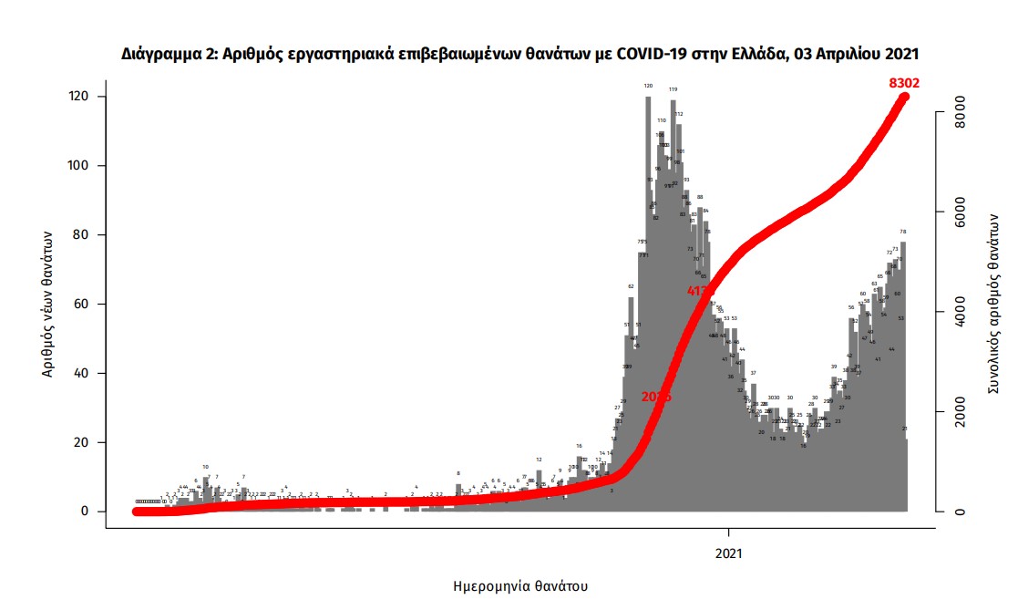 Οι νέοι θάνατοι ασθενών με COVID-19 είναι 70, ενώ από την έναρξη της επιδημίας έχουν καταγραφεί συνολικά 8.302 θάνατοι. Το 95.7% είχε υποκείμενο νόσημα ή/και ηλικία 70 ετών και άνω.
