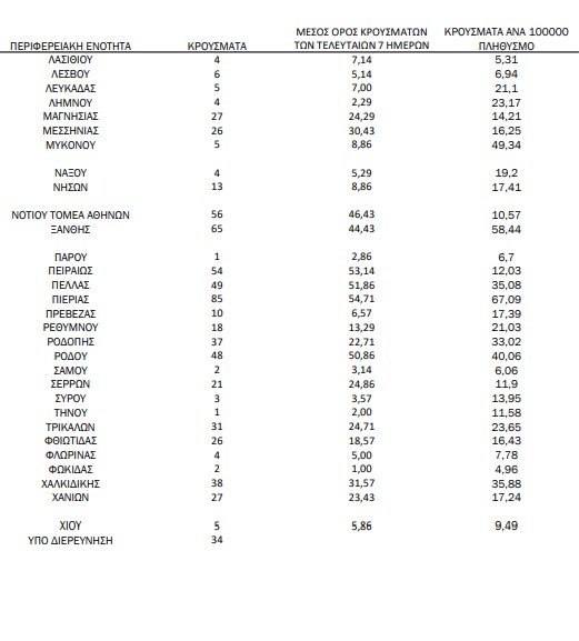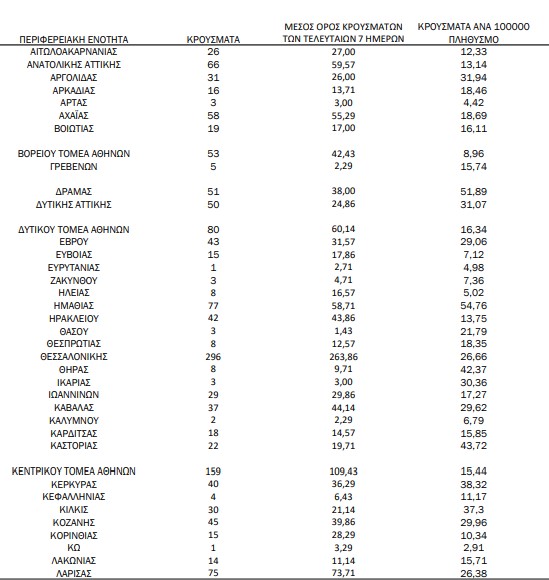 Τα νέα εργαστηριακά επιβεβαιωμένα κρούσματα της νόσου που καταγράφηκαν τις τελευταίες 24 ώρες είναι 2.190, εκ των οποίων 18 εντοπίστηκαν κατόπιν ελέγχων στις πύλες εισόδου της χώρας. Ο συνολικός αριθμός των κρουσμάτων ανέρχεται σε 629.498 (ημερήσια μεταβολή +0.3%), εκ των οποίων 51.0% άνδρες. Με βάση τα επιβεβαιωμένα κρούσματα των τελευταίων 7 ημερών, 139 θεωρούνται σχετιζόμενα με ταξίδι από το εξωτερικό και 3.204 είναι σχετιζόμενα με ήδη γνωστό κρούσμα.