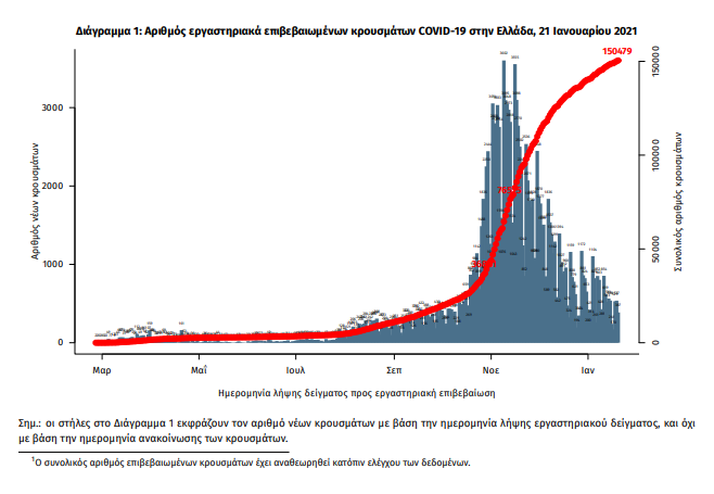 Τα στοιχεία που παρουσιάζονται αφορούν περιστατικά από την επιδημιολογική επιτήρηση της νόσου από το νέο κορωνοϊό (COVID19), με βάση τα δεδομένα που έχουν δηλωθεί στον ΕΟΔΥ και καταγραφεί μέχρι τις 21 Ιανουαρίου 2021 (ώρα 15:00). Τα νέα εργαστηριακά επιβεβαιωμένα κρούσματα της νόσου είναι 509, εκ των οποίων 1 εντοπίστηκε κατόπιν ελέγχων στις πύλες εισόδου της χώρας. Ο συνολικός αριθμός των κρουσμάτων ανέρχεται σε 150479 (ημερήσια μεταβολή +0.3%), εκ των οποίων 52.1% άνδρες. 1 Οι νέοι θάνατοι ασθενών με COVID-19 είναι 25, ενώ από την έναρξη της επιδημίας έχουν καταγραφεί συνολικά 5570 θάνατοι. Η διάμεση ηλικία των ασθενών που απεβίωσαν είναι 79 έτη. Ο αριθμός των ασθενών που νοσηλεύονται διασωληνωμένοι είναι 293 (70.0% άνδρες). Η ημερήσια κατανομή των επιβεβαιωμένων κρουσμάτων είναι η ακόλουθη (η γραμμή παριστάνει την συνολική, αθροιστική κατανομή των κρουσμάτων).