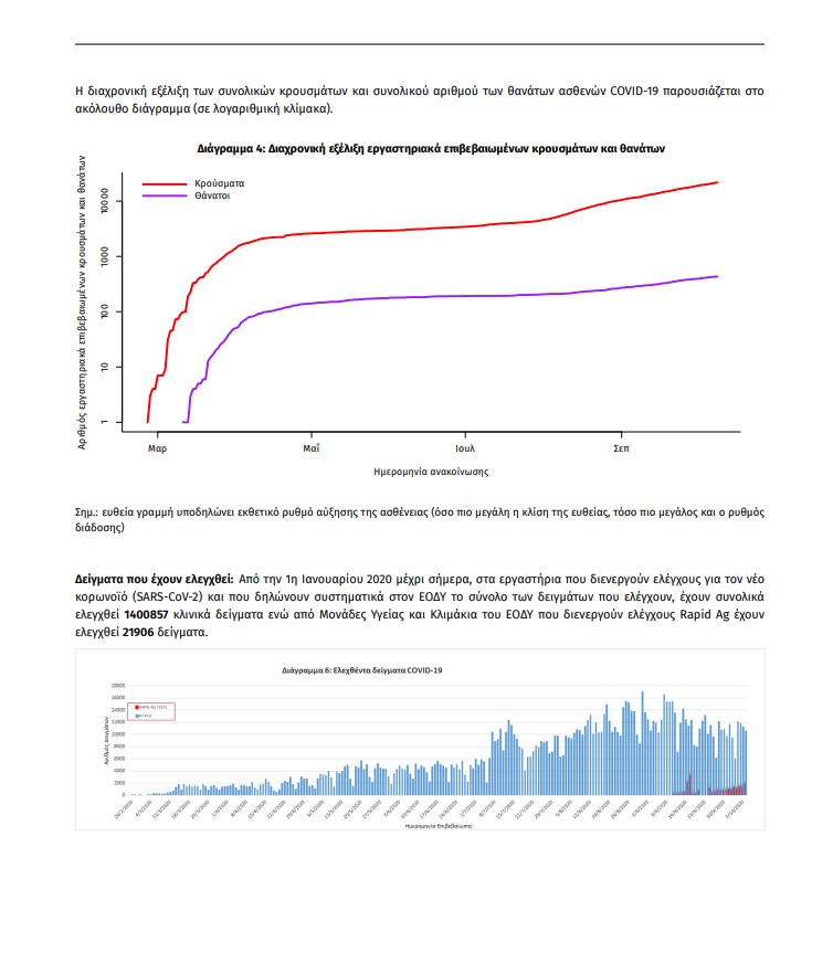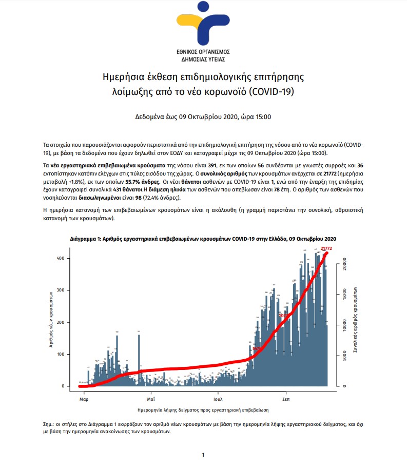«Σήμερα ανακοινώνουμε 391 νέα κρούσματα του νέου ιού στη χώρα, εκ των οποίων 56 συνδέονται με γνωστές συρροές και 36 εντοπίστηκαν κατόπιν ελέγχων στις πύλες εισόδου της χώρας. Ο συνολικός αριθμός των κρουσμάτων είναι 21772, εκ των οποίων το 55.7% άνδρες.