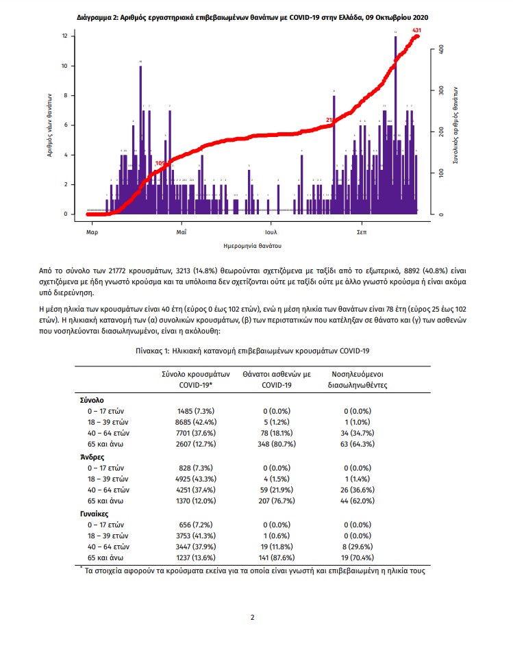 Τέλος, έχουμε 1 ακόμα καταγεγραμμένους θανάτους και 431 θανάτους συνολικά στη χώρα. 161 (37.4%) γυναίκες και οι υπόλοιποι άνδρες. Η διάμεση ηλικία των θανόντων συμπολιτών μας ήταν τα 78 έτη και το 96.5% είχε κάποιο υποκείμενο νόσημα ή/και ηλικία 70 ετών και άνω».