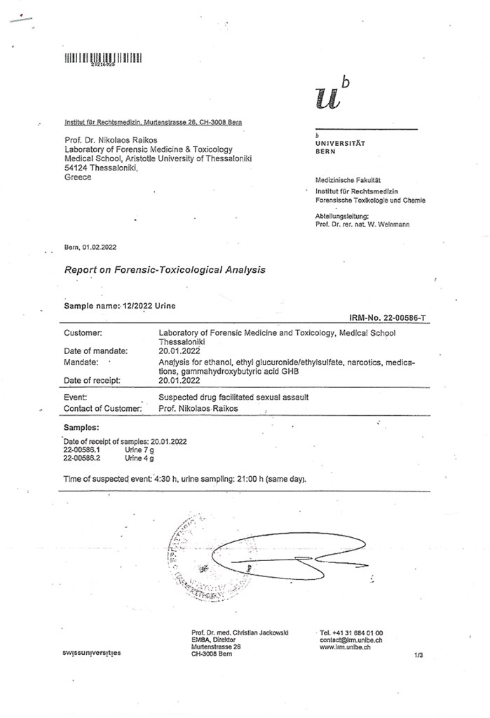 4. Στην κατάσταση που βρίσκονταν τα δύο δείγματα ούρων που εστάλησαν στη Βέρνη της Ελβετίας δεν ήταν δυνατή η ανίχνευση συγκεκριμένων φαρμάκων ή αλλων ουσιών ή ακόμα και της «υγρής extasy».
