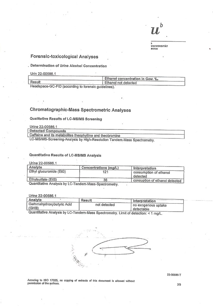 Μια δεύτερη διαπίστωση των Ελβετών είναι ότι καθίσταται αδύνατος ο εντοπισμός ουσιών όπως «Υγρό Έκστασι», ξενοβιοτικά και φάρμακα κατάχρησης μετά την παρέλευση τόσο πολλών ωρών μεταξύ της ώρας του συμβάντος και της λήψης των ούρων. Επίσης, οι ιατροδικαστές της Βέρνης αναφέρουν πως ένας θεωρητικός υπολογισμός της συγκέντρωσης αλκοόλ στο αίμα είναι δυνατός μόνον αν προηγουμένως έχουν γίνει γνωστά κάποια στοιχεία, όπως το βάρος και το ύψος του σώματος, αλλά και η ακριβής ώρα του συμβάντος – εν προκειμένω ο βιασμός. Οι Ελβετοί αφήνουν να εννοηθεί, δηλαδή, πως ούτε αυτά τα στοιχεία εστάλησαν στο εργαστήριο της Βέρνης.