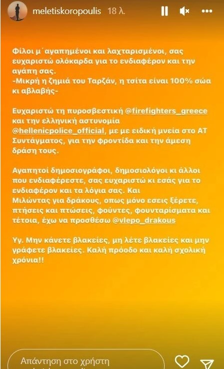 Ο 35χρονος που έπεσε στο κενό στην Τσακάλωφ, αλλά γλίτωσε χάρη στην τέντα του καταστήματος στο ισόγειο είναι ο Μελέτης Κοροπούλης. Σε ανάρτησή του αναφέρει πως η πτώση ήταν ατύχημα και μέσω του Instagram καλεί τους δημοσιογράφουςνα «μην γράφετε βλακείες».