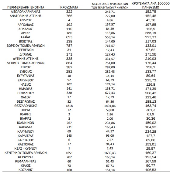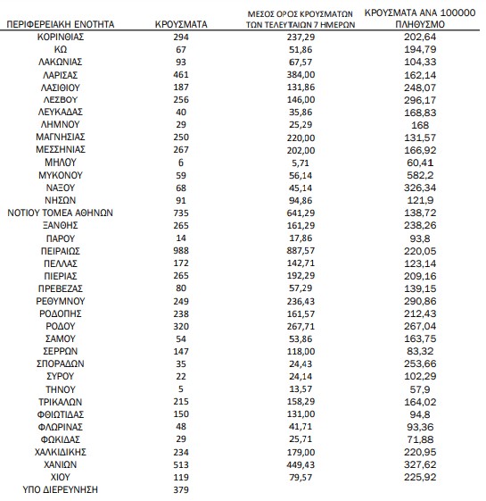 Υπενθυμίζεται πως τα περισσότερα σε αριθμό περιστατικά που είχε καταγράψει ο ΕΟΔΥ μέχρι σήμερα σε μία ημέρα ανακοινώθηκαν την Τρίτη 4 Ιανουαρίου 2022, όταν εντοπίστηκαν 50.126 περιπτώσεις σε ένα 24ωρο. Επίσης, ο μεγαλύτερος αριθμός θανάτων εξαιτίας του ιού σε ένα 24ωρο καταγράφηκε το Σάββατο 14 Δεκεμβρίου 2021, όταν έχασαν τη ζωή τους 130 ασθενείς.