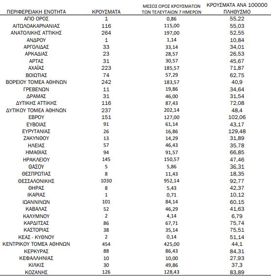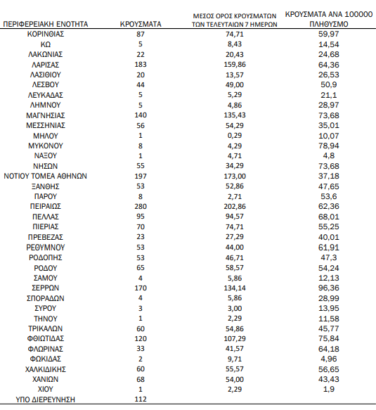 Υπενθυμίζεται πως τα περισσότερα σε αριθμό περιστατικά που είχε καταγράψει ο ΕΟΔΥ μέχρι σήμερα σε μία ημέρα ανακοινώθηκαν την Τρίτη 9 Νοεμβρίου 2021, όταν εντοπίστηκαν 8.613 περιπτώσεις σε ένα 24ωρο. Επίσης, ο μεγαλύτερος αριθμός θανάτων εξαιτίας του ιού σε ένα 24ωρο καταγράφηκε το Σάββατο 28 Νοεμβρίου 2020, όταν έχασαν τη ζωή τους 121 ασθενείς.