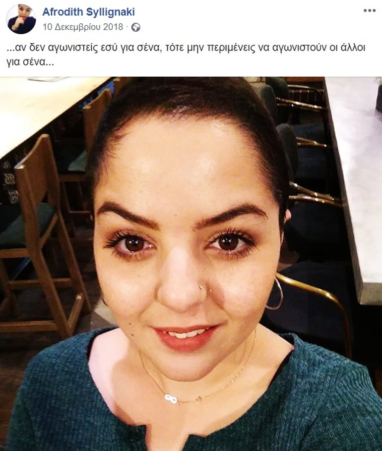 Μέχρι πριν από λίγο καιρό, με αναρτήσεις της στο facebook, έδειχνε τη δύναμή της κι έδινε κουράγιο και σε άλλους ανθρώπους με τη γενναιότητα που αντιμετώπιζε την ασθένειά της.