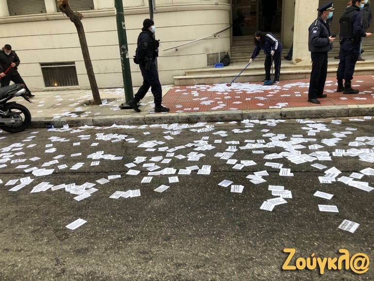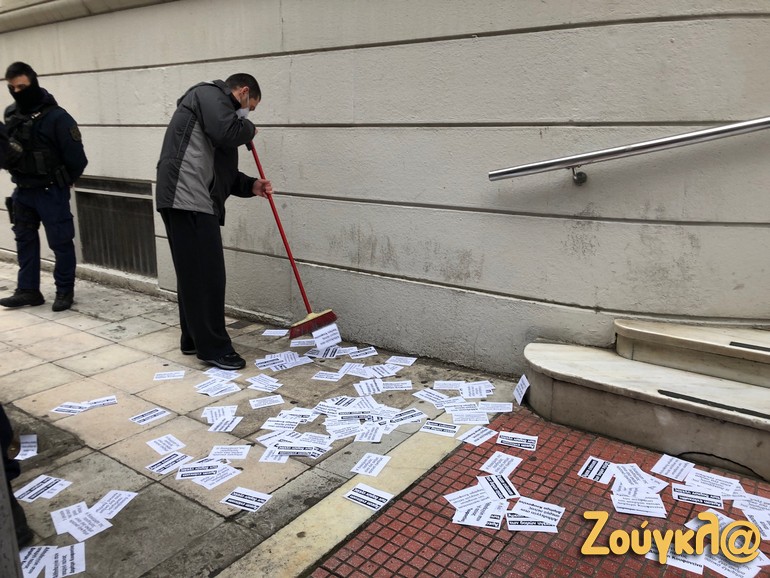 Έξω από το υπουργείο υπάρχουν δυνάμεις των ΜΑΤ και λίγο πριν από τις 08:00 η αστυνομία τούς προσήγαγε με κλούβα και τους μετέφερε στη ΓΑΔΑ.