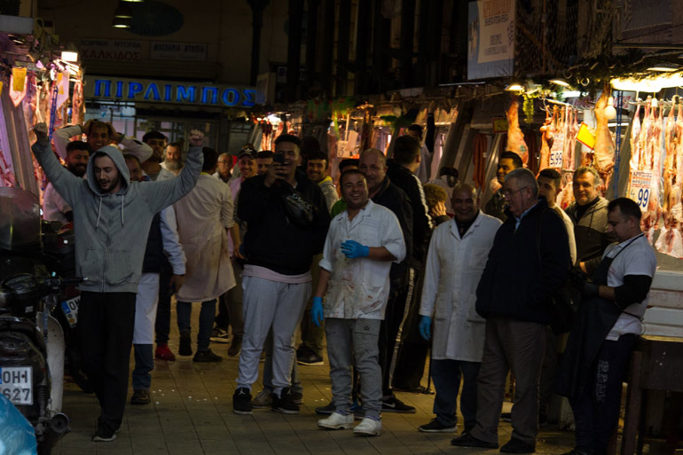 «Κατά την ειρηνική διαμαρτυρία της Ομάδας DxE στη Βαρβάκειο Αγορά για τις σφαγές ζώων το Πάσχα, οι κρεοπώλες αντέδρασαν με περιπαιχτικά σχόλια και χορούς, με πέταγμα αντικειμένων, με έναν κουβά γεμάτο με αίμα προς τους διαδηλωτές και με δυναμιτάκια» αναφέρει η οργάνωση.