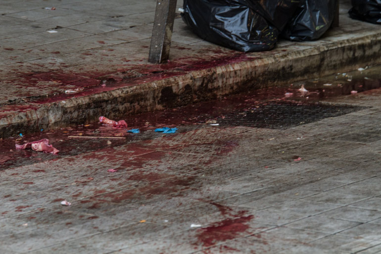 Όπως φαίνεται από τα βίντεο αλλά και σύμφωνα με τις καταγγελίες των ακτιβιστών, η αντίδραση των κρεοπωλών ήταν ιδιαίτερα προκλητική, καθώς πέταξαν κροτίδες κι άλλα αντικείμενα προς τους διαδηλωτές, αλλά κι έναν κουβά γεμάτο… αίμα.