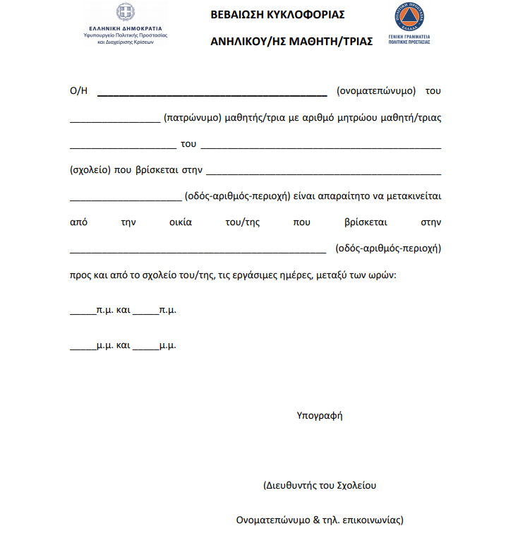 Κατεβάστε από ΕΔΩ τη βεβαίωση μετακίνησης μαθητή