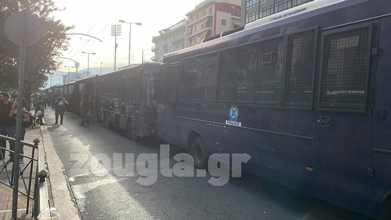 Σήμερα απαγορεύονται η στάση και η στάθμευση των οχημάτων στην ευρύτερη περιοχή του Εφετείου. Μπροστά από τα δικαστήρια έχει σχηματιστεί τείχος από κλούβες της αστυνομίας.