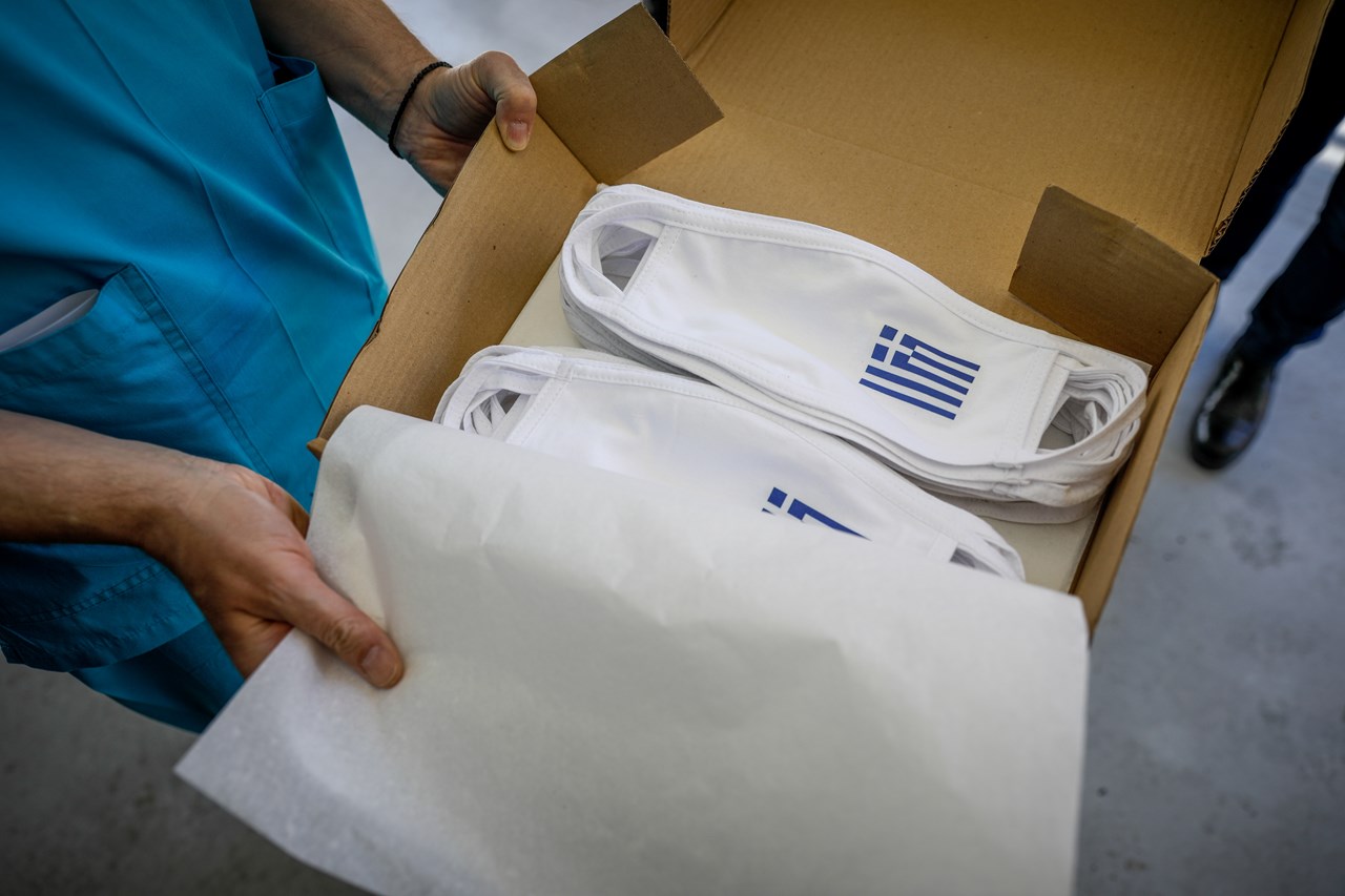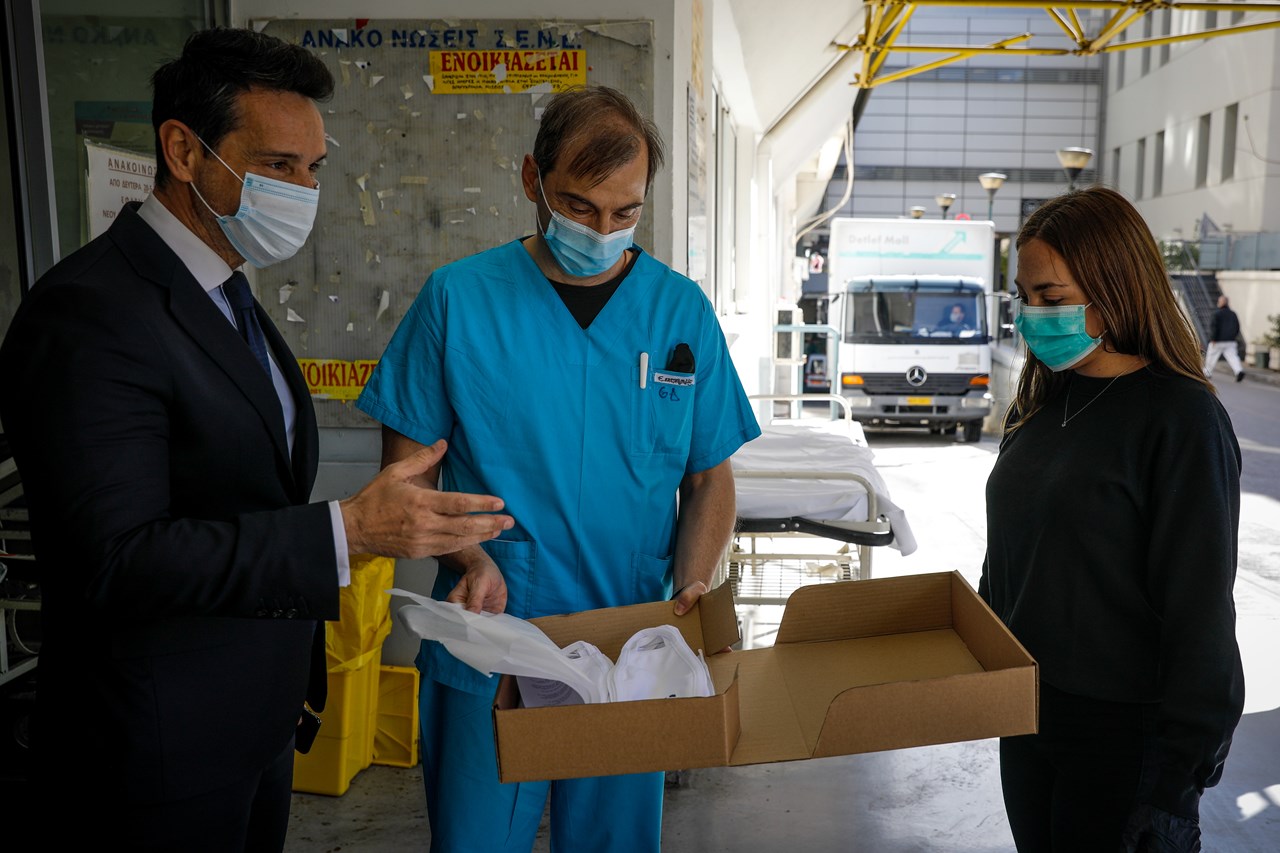Τις μάσκες παρέλαβε ο Ευάγγελος Μπαλής, επικεφαλής της μονάδας για τον COVID-19 του «Ευαγγελισμού», που είναι ένα από τα νοσοκομεία αναφοράς για την πανδημία.