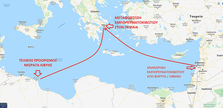 Το κοντέινερ είχε προορισμό τη Λιβύη -έκανε στάση στον Πειραιά-, ενώ ξεκίνησε το ταξίδι του από τη Βηρυτό στις 20 Δεκεμβρίου.