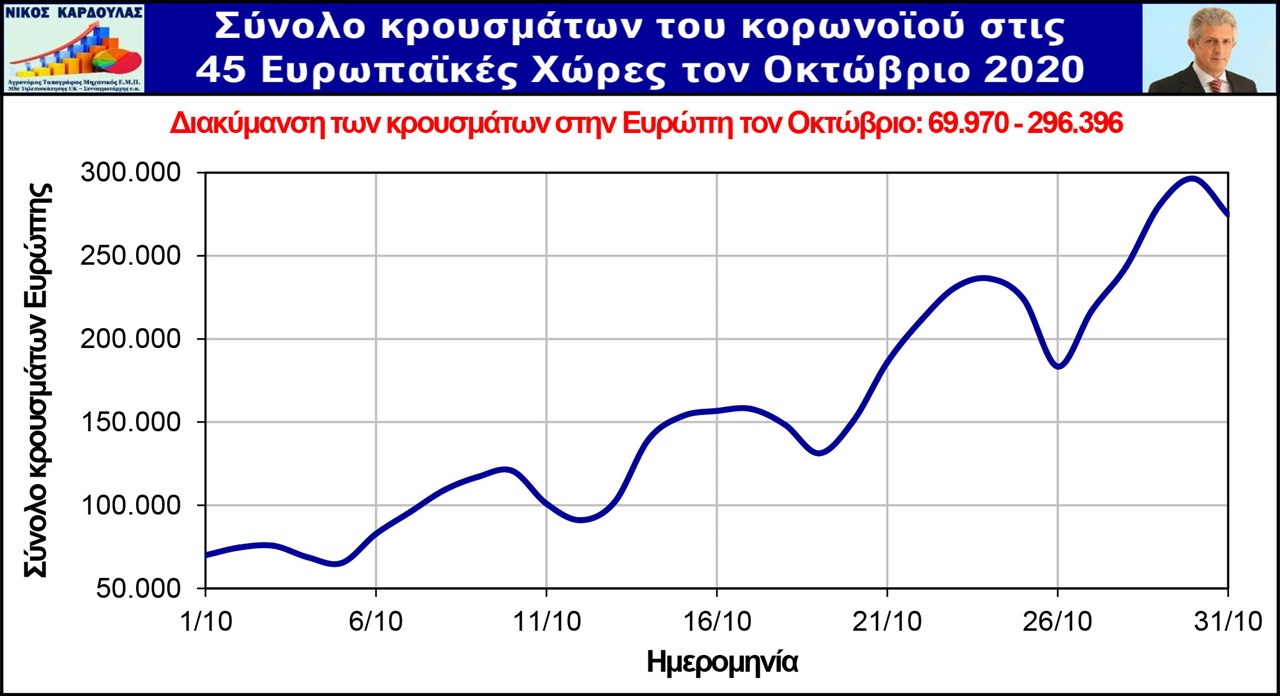 Δραματικές διαστάσεις έλαβε η πανδημία στην Ευρώπη τον Οκτώβριο, όπου το σύνολο των κρουσμάτων στις 45 ευρωπαϊκές χώρες άγγιξε τα 5 εκατομμύρια (4.796.432), ενώ τα ημερήσια κρούσματα πλησίασαν τις 300.000 (296.396) και φαίνονται στο παρακάτω γράφημα.