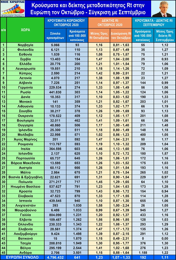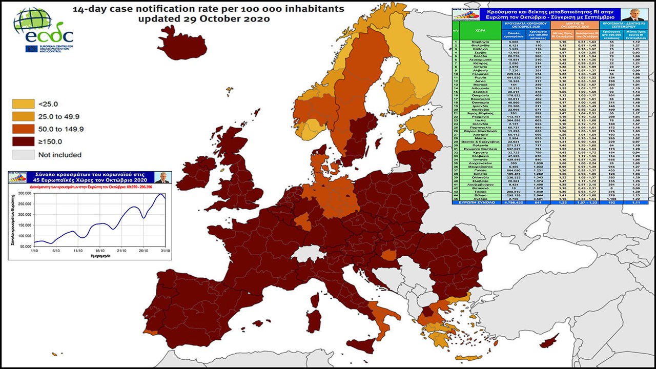 Στον παρακάτω πίνακα αποτυπώνονται το σύνολο των κρουσμάτων, τα κρούσματα ανά 100.000 κατοίκους και ο μέσος όρος του δείκτη μεταδοτικότητας Rt και η διακύμανσή του τον Οκτώβριο, ανά ευρωπαϊκή χώρα. Γίνεται επίσης σύγκριση με τα αντίστοιχα στοιχεία του Σεπτεμβρίου.