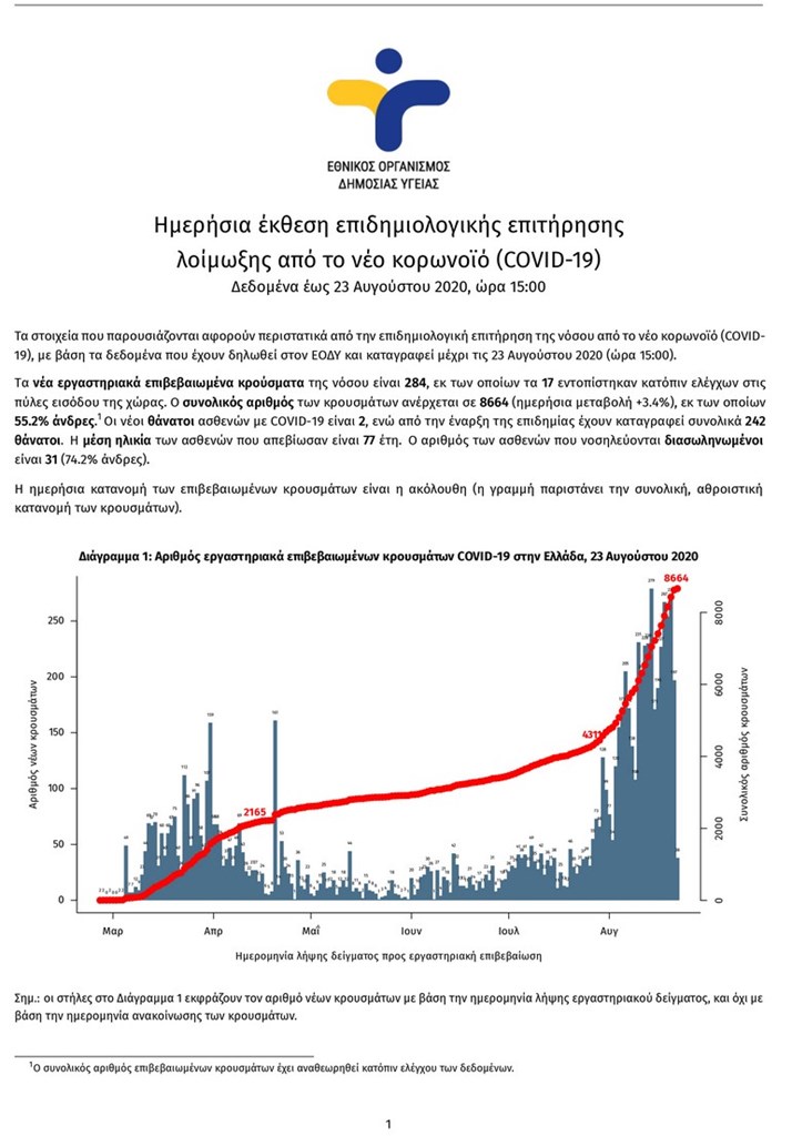 284 νέα κρούσματα του νέου ιού στη χώρα, εκ των οποίων τα 17 εντοπίστηκαν κατόπιν ελέγχων στις πύλες εισόδου τις χώρας. Ο συνολικός αριθμός των κρουσμάτων είναι 8664, εκ των οποίων το 55.2% άνδρες.