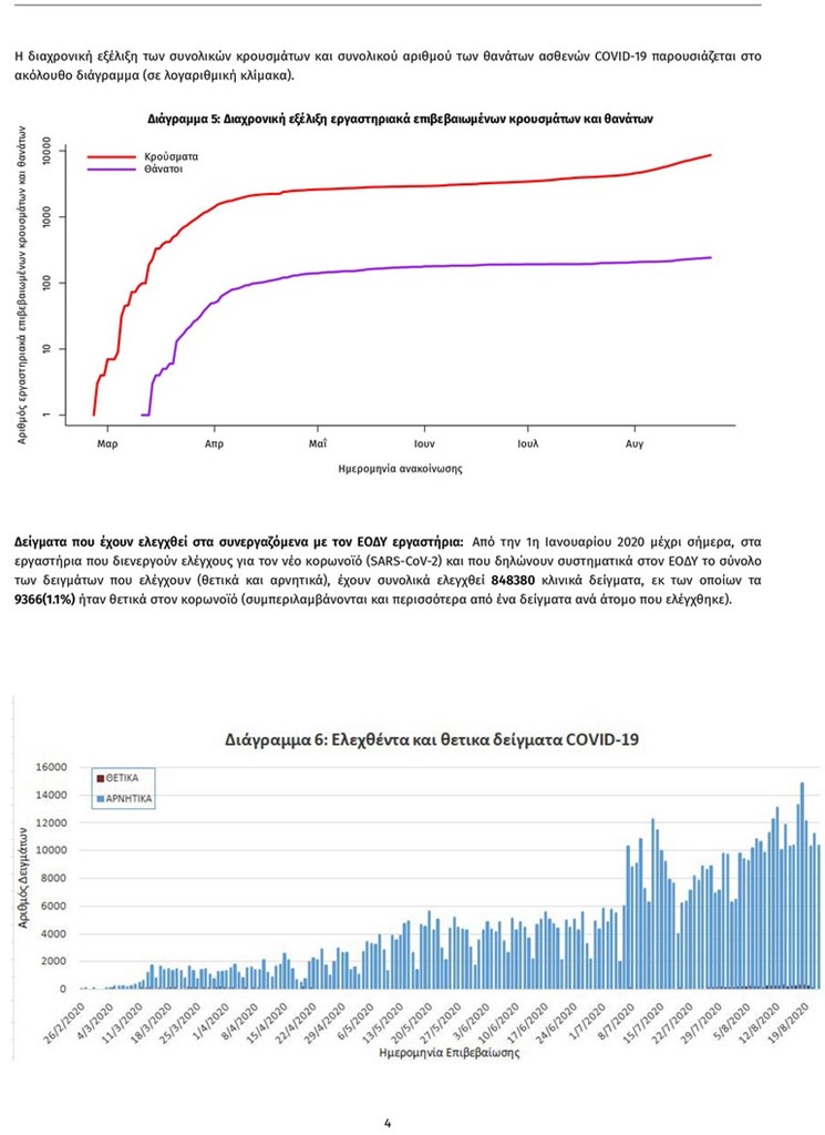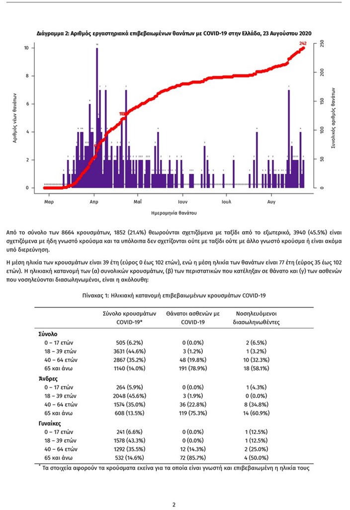 Τέλος, έχουμε 2 ακόμα καταγεγραμμένους θανάτους και 242 θανάτους συνολικά στη χώρα. 84 (34.7%) γυναίκες και οι υπόλοιποι άνδρες. Η διάμεση ηλικία των θανόντων συμπολιτών μας ήταν τα 77 έτη και το 94.6% είχε κάποιο υποκείμενο νόσημα ή/και ηλικία 70 ετών και άνω.