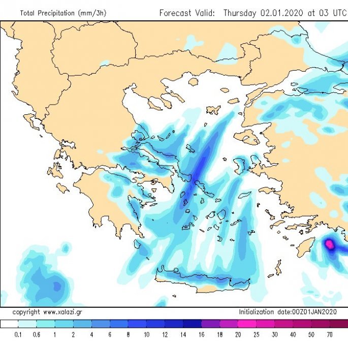 Την Πέμπτη 2 Ιανουαρίου 2020 αναμένονται τοπικές βροχές και χιόνια στα νότια και ανατολικά. Τα φαινόμενα στην Κρήτη και τα Δωδεκάνησα από το απόγευμα θα είναι κατά τόπους ισχυρά. Η θερμοκρασία θα παρουσιάσει πτώση. Οι βόρειοι άνεμοι στο Αιγαίο θα φτάνουν τα 9 μποφόρ.